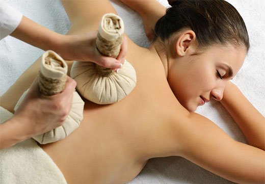 aceite de sésamo y bolsitas de hierbas calentadas a vapor.